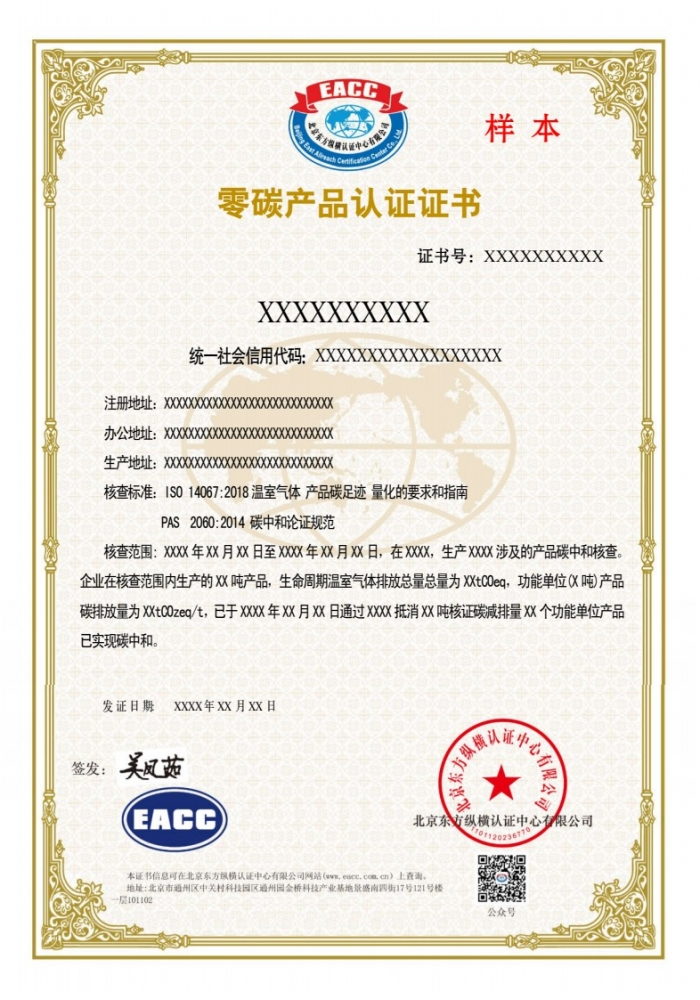 零碳产品认证证书样本