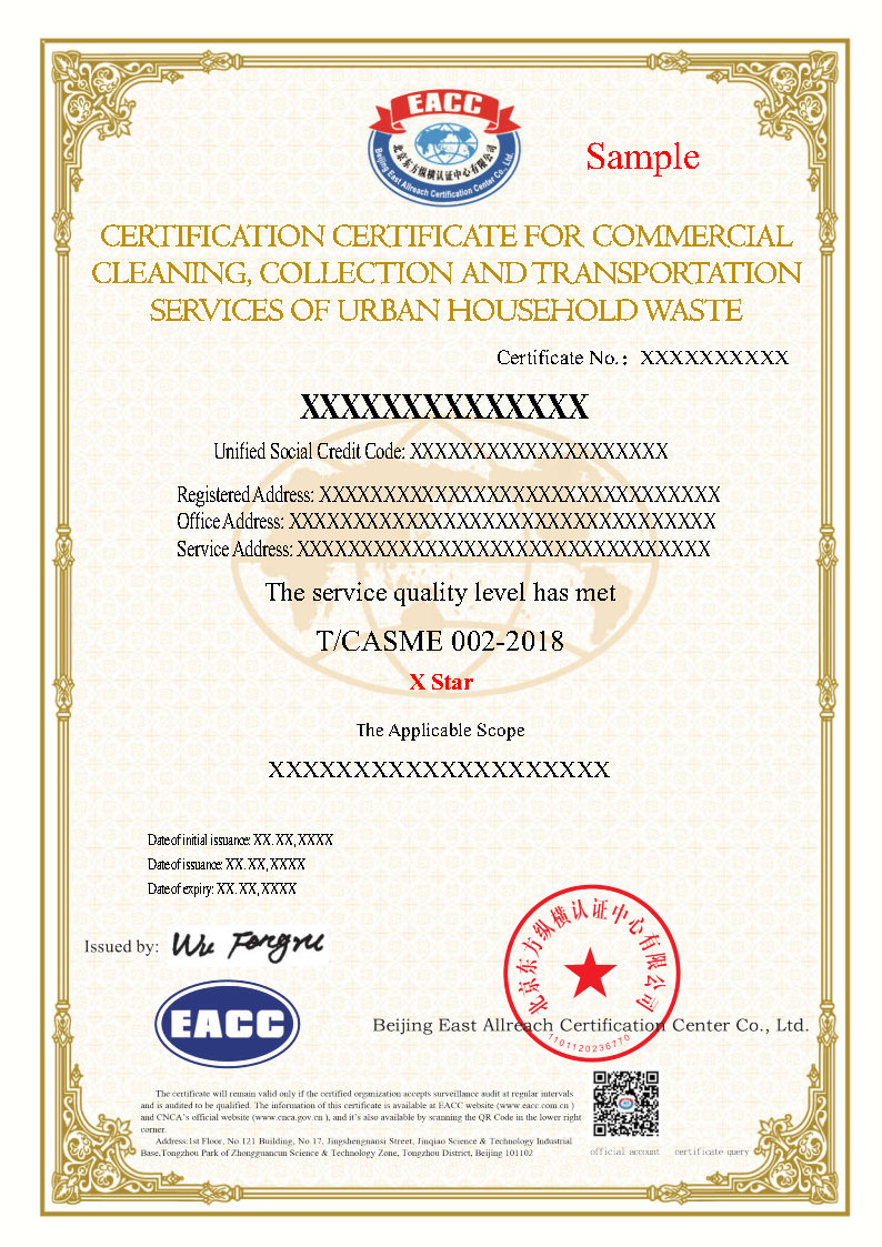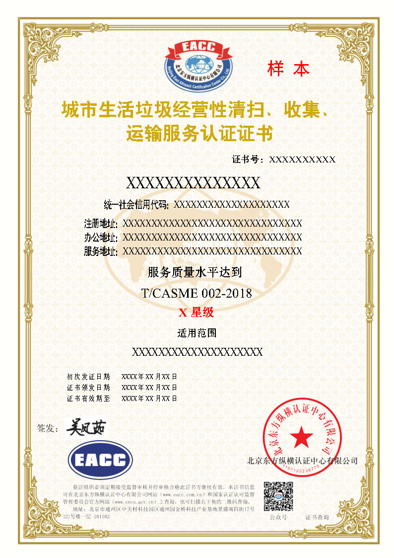 城市生活垃圾经营性清扫、收集、运输服务证书样本