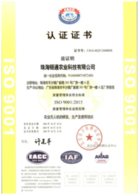 热烈祝贺“珠海通农业科技有限公司”通过ISO 9001:2015质量管理系认证,并获得带有ANAB标志认可证书!