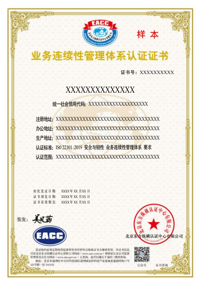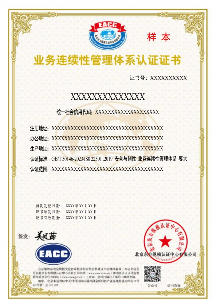 业务连续性管理体系证书样本